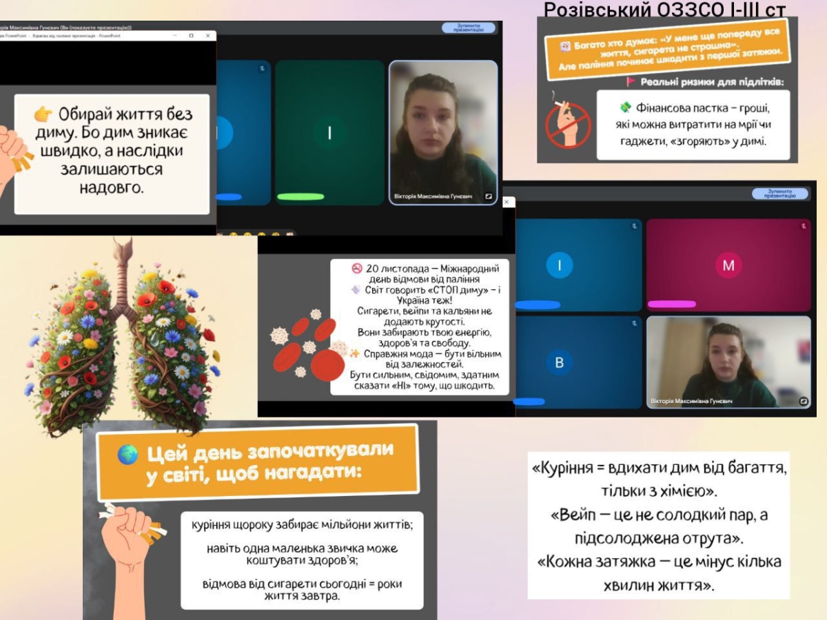 До Міжнародного дня відмови від паління соціальним педагогом Гунєвич Вікторією Максимівною було проведено профілактично-інформаційний захід для учнів 9, 11 класів «Дим зникає швидко, а наслідки залишаються надовго».
