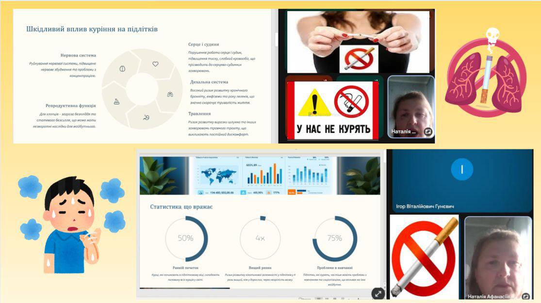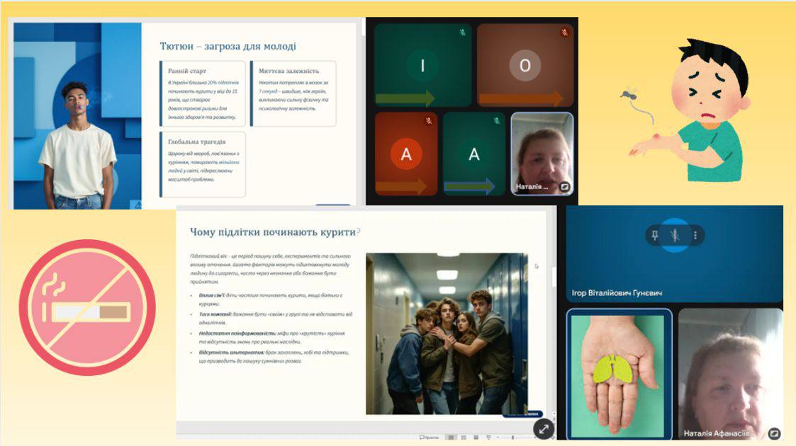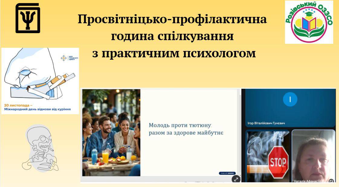 21 листопада 2025 року для учнів 9, 11 класів практичним психологом Линьковою Н.А. проведено просвітницько-профілактичну годину спілкування «Молодь проти тютюну: разом за здорове майбутнє». Мета заходу: формування у здобувачів освіти усвідомленого ставлення до власного здоров’я, розвиток навичок прийняття відповідальних рішень щодо збереження життя та профілактики шкідливих звичок, зокрема тютюнопаління. Учні виявили зацікавленість та готовність обговорювати важливу для молоді тему, активно міркували над причинами залучення підлітків до куріння.