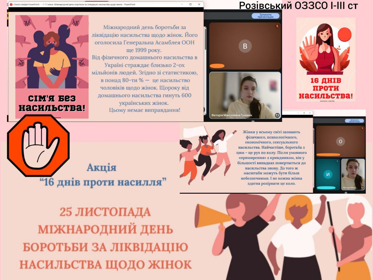 Під час заходу учні ознайомилися з тим, що це за акція, які важливі дати вона охоплює та які теми піднімає. Також було розглянуто поняття насильства, його основні види, окрему увагу приділено темі домашнього насильства. Учні дізналися про актуальну статистику та факти, що стосуються цієї проблеми, а також про цикл насильства та його особливості.