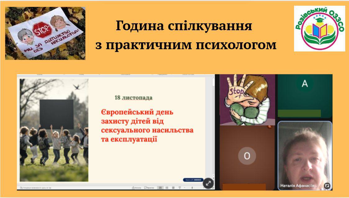 У рамках відзначення Європейського дня захисту дітей від сексуального насильства та експлуатації (18 листопада) практичним психологом Линьковою Н.А. було проведено тематичну годину спілкування з учнями 9-го класу. Метою заходу було підвищення рівня обізнаності здобувачів освіти щодо безпеки, формування навичок розпізнавання ризикових ситуацій та розвитку відповідального ставлення до власної безпеки.
